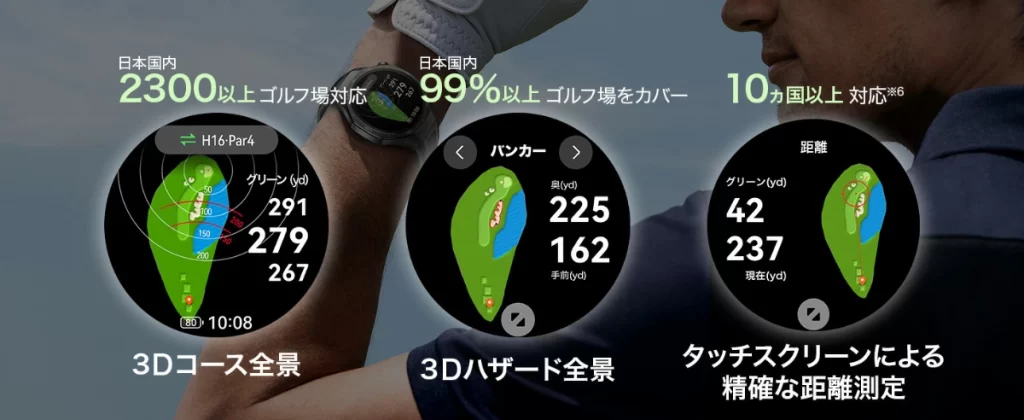 - ゴルフ機能: 3Dゴルフマップ、グリーン傾斜表示、ハザード距離測定