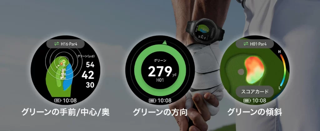 このモデルは、ゴルフ場での戦略的なプレーをサポートするために設計されており、特にグリーンの傾斜やハザード情報の詳細表示が強化されています。ゴルフのパフォーマンス向上を目指すなら、便利な機能が揃っています。詳しくは後述します。